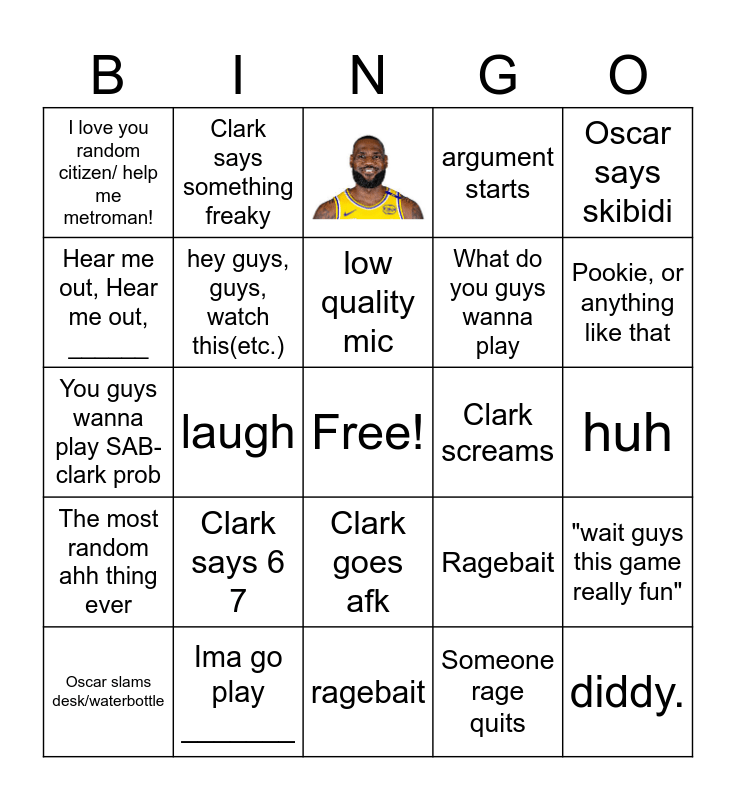 This bingo card has 1 images, a free space and 23 words: Clark says 6 7, Ima go play _______, low quality mic, Oscar slams desk/waterbottle, Oscar says skibidi, I love you random citizen/ help me metroman!, Hear me out, Hear me out, ______, Clark says something freaky, Clark screams, Clark goes afk, What do you guys wanna play, You guys wanna play SAB-clark prob, Ragebait, "wait guys this game really fun", hey guys, guys, watch this(etc.), Someone rage quits, huh, Pookie, or anything like that, laugh, diddy., The most random ahh thing ever, argument starts and ragebait.