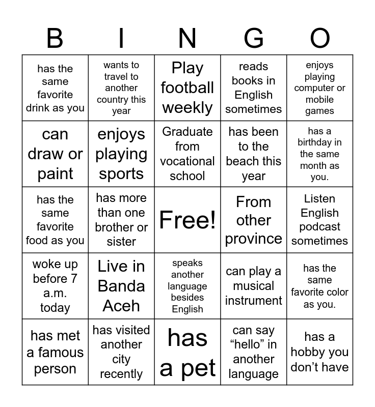 This bingo card has a free space and 24 words: Live in Banda Aceh, has visited another city recently, Graduate from vocational school, has met a famous person, enjoys playing computer or mobile games, has the same favorite drink as you, can draw or paint, wants to travel to another country this year, From other province, speaks another language besides English, has been to the beach this year, has the same favorite food as you, can play a musical instrument, has the same favorite color as you., enjoys playing sports, can say “hello” in another language, Listen English podcast sometimes, Play football weekly, has a birthday in the same month as you., has more than one brother or sister, has a hobby you don’t have, woke up before 7 a.m. today, reads books in English sometimes and has a pet.