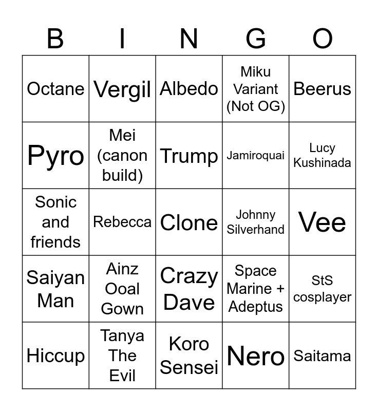 This bingo card has a free space and 24 words: Ainz Ooal Gown, Tanya The Evil, Trump, Hiccup, Beerus, Octane, Pyro, Vergil, Johnny Silverhand, Crazy Dave, Jamiroquai, Sonic and friends, Space Marine + Adeptus, StS cosplayer, Mei (canon build), Nero, Vee, Albedo, Lucy Kushinada, Rebecca, Saitama, Saiyan Man, Miku Variant (Not OG) and Koro Sensei.