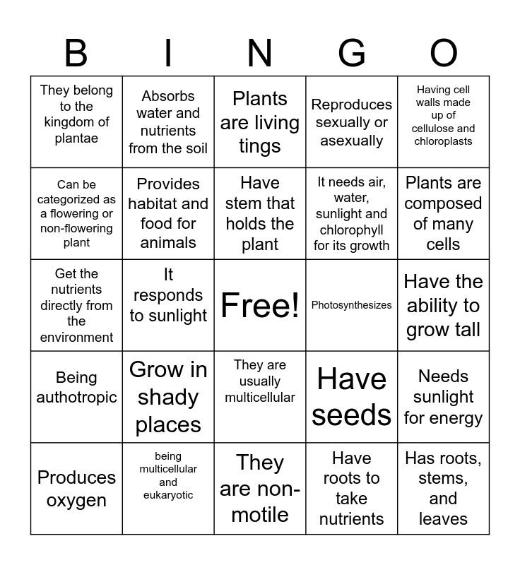 This bingo card has a free space and 24 words: Produces oxygen, Grow in shady places, Have stem that holds the plant, Have roots to take nutrients, Having cell walls made up of cellulose and chloroplasts, They belong to the kingdom of plantae, Absorbs water and nutrients from the soil, Plants are living tings, Photosynthesizes, Have the ability to grow tall, Get the nutrients directly from the environment, Provides habitat and food for animals, Have seeds, Needs sunlight for energy, Can be categorized as a flowering or non-flowering plant, being multicellular and eukaryotic, They are non-motile, Reproduces sexually or asexually, Plants are composed of many cells, Being authotropic, It responds to sunlight, They are usually multicellular, It needs air, water, sunlight and chlorophyll for its growth and Has roots, stems, and leaves.