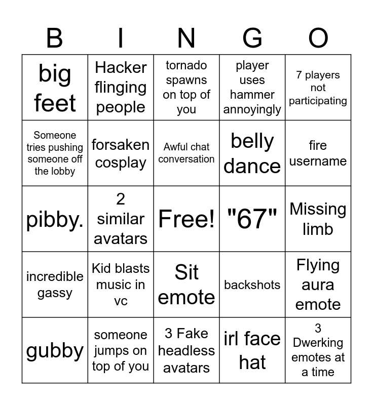 This bingo card has a free space and 52 words: Hacker jorking it, 3 Dwerking emotes at a time, You get flung, 3 Fake headless avatars, Kid blasts music in vc, Furry, Hacker flinging people, Hacker uses the force, Someone tries pushing someone off the lobby, More than one disaster, forsaken cosplay, big avatar, Flying aura emote, backshots, 2 people are flung, Objectively hideous avatar, Awful chat conversation, "67", that bouncing spider emote, 7 players not participating, 2 similar avatars, irl face hat, big feet, belly dance, Player gets bored in chat, Cosplay of something outside of roblox, 3 b/w avatars, "Join me in (popular game)", fire username, username based off of roblox game, player removes the bridge from the ship with hammer, player uses hammer annoyingly, 2 vr players, vr player gets harrased, Gooner avatar (suggestive), tornado spawns on top of you, someone jumps on top of you, player tower, X3 face, 3 speech bubble avatars, anime avatar, Missing limb, incredible gassy, duplicate bingo space, Sit emote, RP, c00lkidd, pibby., face tracking, Betrayed 1x, gubby and adidas anim pack.