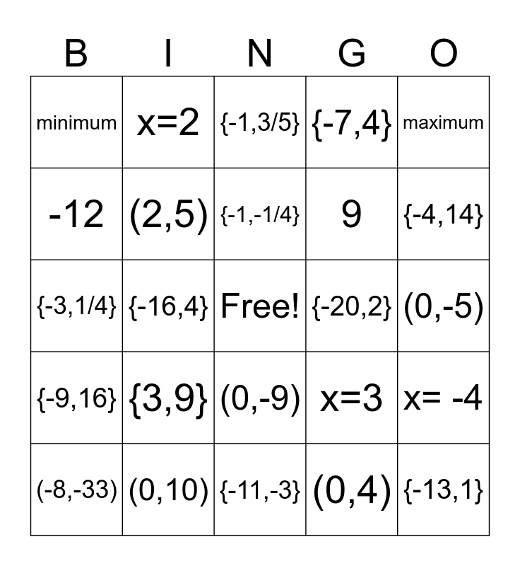 This bingo card has a free space and 26 words: (0,-9), (0,4), {-1,-1/4}, (0,10), maximum, minimum, -12, x=2, (0,-5), x=3, 9, {-3,1/4}, x= -4, (-8,-33), {-16,4}, {-2,13}, {-7,4}, {-9,16}, {-1,3/5}, {-13,1}, {-4,14}, {-11,-3}, {-20,2}, {3,9}, (2,5) and (-4,2).
