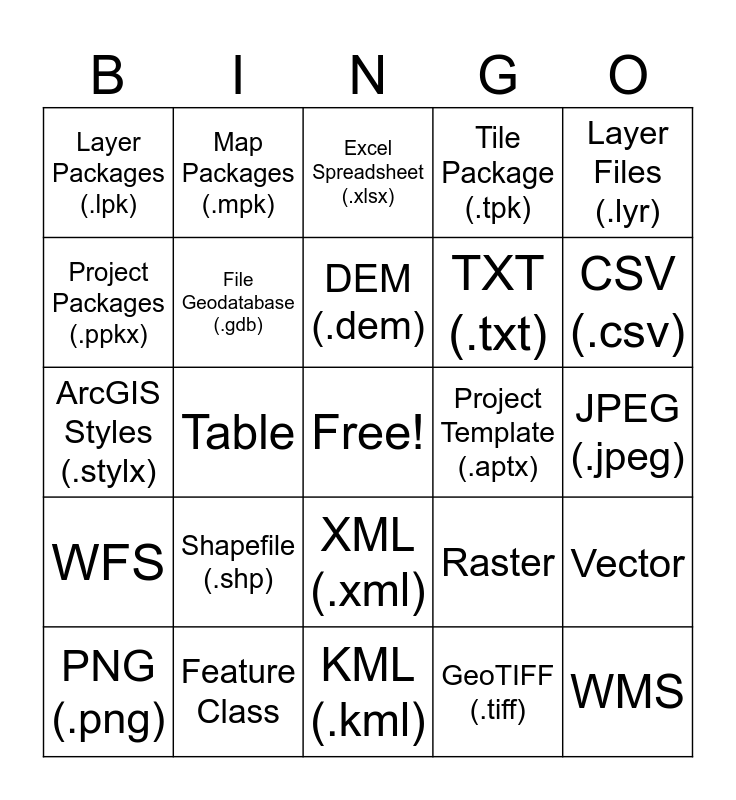 This bingo card has a free space and 24 words: Shapefile (.shp), Feature Class, DEM (.dem), PNG (.png), Layer Files (.lyr), Layer Packages (.lpk), Project Packages (.ppkx), Map Packages (.mpk), Project Template (.aptx), XML (.xml), TXT (.txt), ArcGIS Styles (.stylx), Raster, Vector, File Geodatabase (.gdb), GeoTIFF (.tiff), JPEG (.jpeg), Excel Spreadsheet (.xlsx), CSV (.csv), Table, WMS, WFS, Tile Package (.tpk) and KML (.kml).