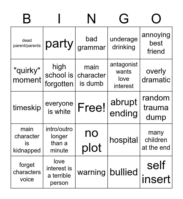This bingo card has a free space and 24 words: intro/outro longer than a minute, love interest is a terrible person, main character is dumb, forget characters voice, annoying best friend, dead parent/parents, "quirky" moment, party, abrupt ending, no plot, antagonist wants love interest, timeskip, hospital, many children at the end, high school is forgotten, bullied, random trauma dump, bad grammar, overly dramatic, everyone is white, self insert, main character is kidnapped, underage drinking and warning.