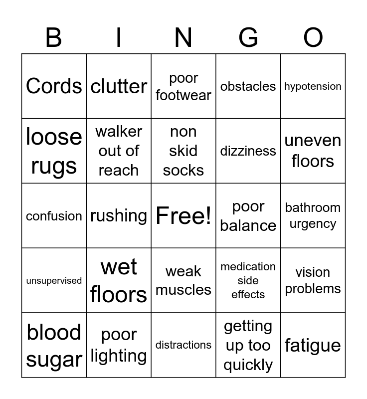 This bingo card has a free space and 24 words: wet floors, poor lighting, non skid socks, blood sugar, hypotension, Cords, loose rugs, clutter, poor balance, weak muscles, dizziness, confusion, medication side effects, vision problems, walker out of reach, getting up too quickly, bathroom urgency, poor footwear, uneven floors, rushing, fatigue, unsupervised, obstacles and distractions.