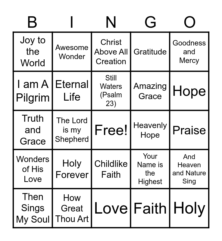 This bingo card has a free space and 24 words: Holy Forever, How Great Thou Art, Still Waters (Psalm 23), Then Sings My Soul, Goodness and Mercy, Joy to the World, I am A Pilgrim, Awesome Wonder, Heavenly Hope, Childlike Faith, Amazing Grace, Truth and Grace, Your Name is the Highest, And Heaven and Nature Sing, Eternal Life, Faith, Praise, Christ Above All Creation, Hope, The Lord is my Shepherd, Holy, Wonders of His Love, Gratitude and Love.