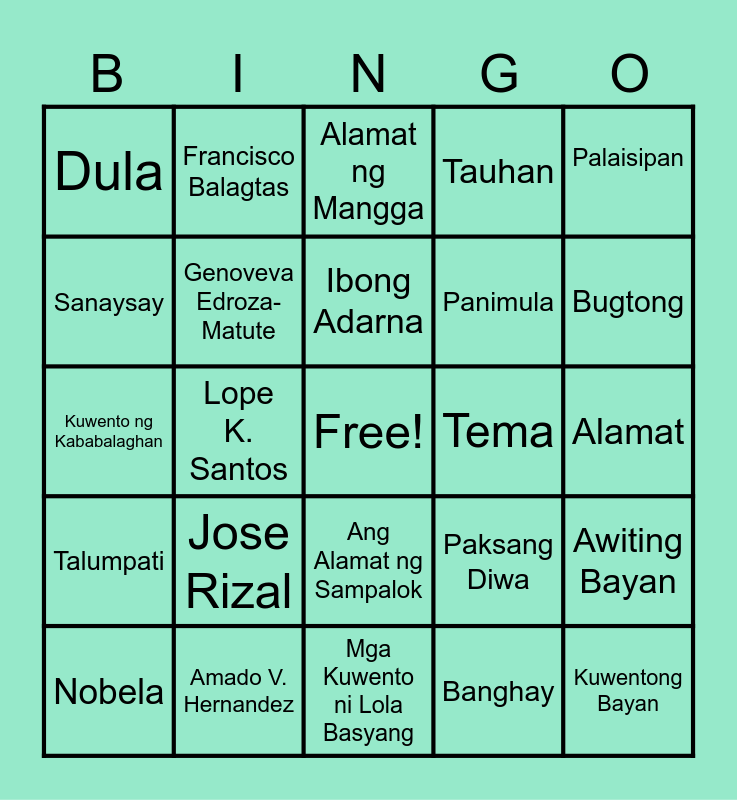 This bingo card has a free space and 24 words: Nobela, Jose Rizal, Ibong Adarna, Banghay, Palaisipan, Dula, Francisco Balagtas, Alamat ng Mangga, Tema, Alamat, Kuwento ng Kababalaghan, Genoveva Edroza-Matute, Paksang Diwa, Awiting Bayan, Sanaysay, Amado V. Hernandez, Mga Kuwento ni Lola Basyang, Tauhan, Bugtong, Talumpati, Lope K. Santos, Ang Alamat ng Sampalok, Panimula and Kuwentong Bayan.