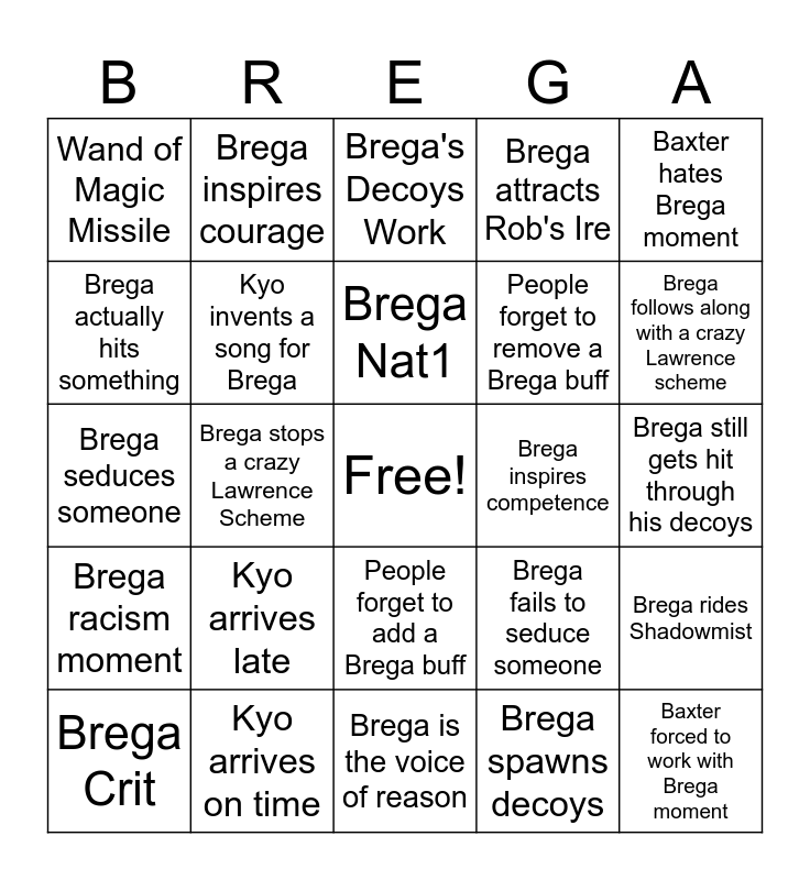 This bingo card has a free space and 24 words: Kyo arrives late, Kyo arrives on time, Brega Nat1, Brega Crit, Baxter hates Brega moment, Wand of Magic Missile, Brega actually hits something, Brega inspires courage, Brega inspires competence, People forget to add a Brega buff, People forget to remove a Brega buff, Brega seduces someone, Brega fails to seduce someone, Brega rides Shadowmist, Kyo invents a song for Brega, Brega spawns decoys, Brega still gets hit through his decoys, Brega's Decoys Work, Brega follows along with a crazy Lawrence scheme, Brega stops a crazy Lawrence Scheme, Baxter forced to work with Brega moment, Brega racism moment, Brega attracts Rob's Ire and Brega is the voice of reason.