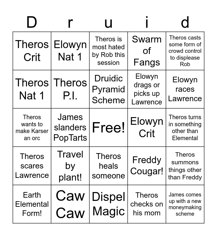 This bingo card has a free space and 24 words: Travel by plant!, Caw Caw, Druidic Pyramid Scheme, Earth Elemental Form!, Theros casts some form of crowd control to displease Rob, Theros Crit, Theros Nat 1, Elowyn Nat 1, Elowyn Crit, Theros heals someone, Elowyn drags or picks up Lawrence, Theros wants to make Karser an orc, Freddy Cougar!, Theros summons things other than Freddy, Theros P.I., Theros checks on his mom, Theros turns in something other than Elemental, Theros is most hated by Rob this session, Elowyn races Lawrence, James slanders PopTarts, James comes up with a new moneymaking scheme, Theros scares Lawrence, Swarm of Fangs and Dispel Magic.