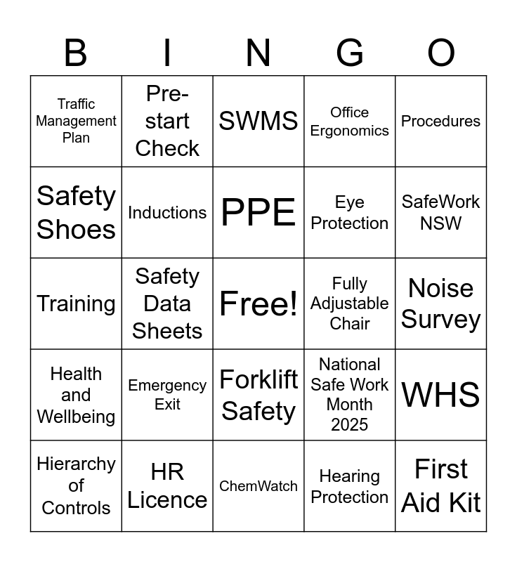 This bingo card has a free space and 75 words: Risk Assessment, Toolbox talk, SWMS, Hazard, Risk, BeSafe, Reporting, Consultation, WHS Committee, Emergency Drill, Fire Warden, High-Viz Clothing, PPE, Safety Shoes, Sun Block, Safety Data Sheets, Mental Health First Aiders, First Aid Kit, First Aid Certificate, Procedures, SWI’s, Training, Inductions, Pre-start Check, Office Ergonomics, Workstation Setup, WHS Act, WHS Regulation, Confined Space, Working at Heights, Sun Safety, Chemical Safety, Fire Safety, National Safe Work Month 2025, SafeWork NSW, Eye Protection, Eye Wash, Testing & Tagging, Noise Survey, Hearing Protection, Elimination Control, Substitution Control, Isolation Control, Engineering Control, Administration Control, PPE Control, Hierarchy of Controls, Traffic Management Plan, Traffic Cones, Free Staff Fitness Classes, Safety Showers, Forklift Safety, Aggression, Incident Investigation, Workers Comp, Slips Trips and Falls, Vehicle Safety, Safety Inspections, Audits, Contractor Safety, Emergency Exit, Machine Guarding, Fall Protection, Pedestrian Safety, Use of Handrails, Fully Adjustable Chair, Work From Home Form, EAP, MindRazr, WHS, Health and Wellbeing, HR Licence, R U OK? Day, ChemWatch and Fitness Passport.