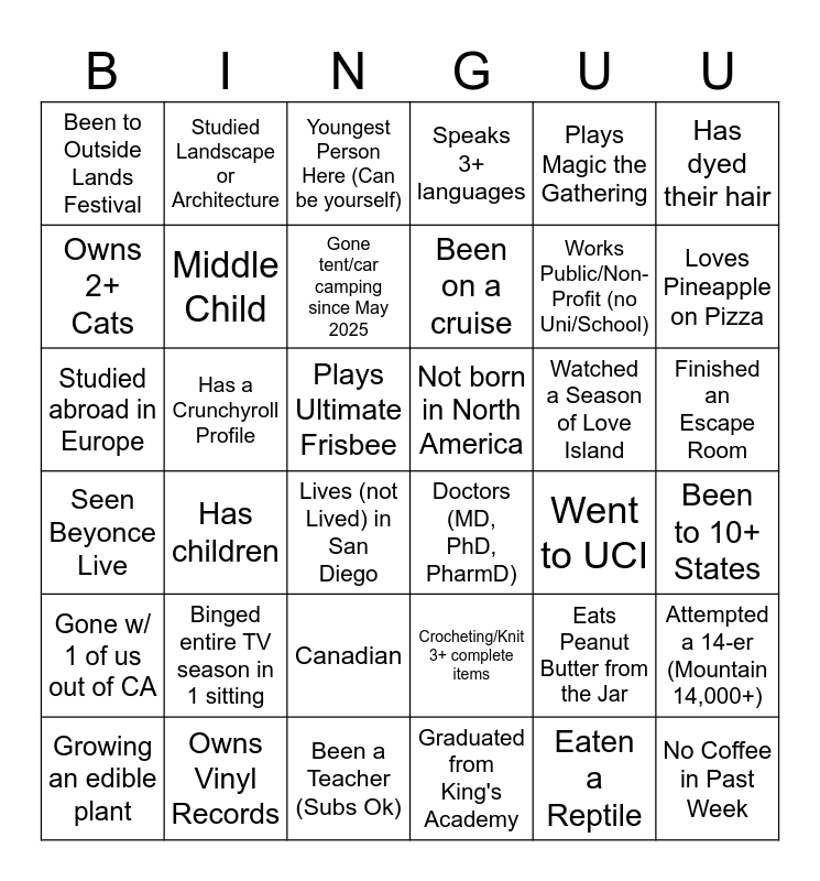 This bingo card has 36 words: Crocheting/Knit 3+ complete items, Canadian, Graduated from King's Academy, Owns 2+ Cats, Seen Beyonce Live, Not born in North America, Middle Child, Been a Teacher (Subs Ok), Plays Magic the Gathering, Eats Peanut Butter from the Jar, Loves Pineapple on Pizza, Speaks 3+ languages, Attempted a 14-er (Mountain 14,000+), Has a Crunchyroll Profile, Been on a cruise, Been to Outside Lands Festival, Gone w/ 1 of us out of CA, Watched a Season of Love Island, Studied abroad in Europe, Youngest Person Here (Can be yourself), Plays Ultimate Frisbee, Has children, Doctors (MD, PhD, PharmD), Lives (not Lived) in San Diego, Went to UCI, Studied Landscape or Architecture, Works Public/Non-Profit (no Uni/School), Owns Vinyl Records, Gone tent/car camping since May 2025, Has dyed their hair, No Coffee in Past Week, Growing an edible plant, Been to 10+ States, Finished an Escape Room, Binged entire TV season in 1 sitting and Eaten a Reptile.