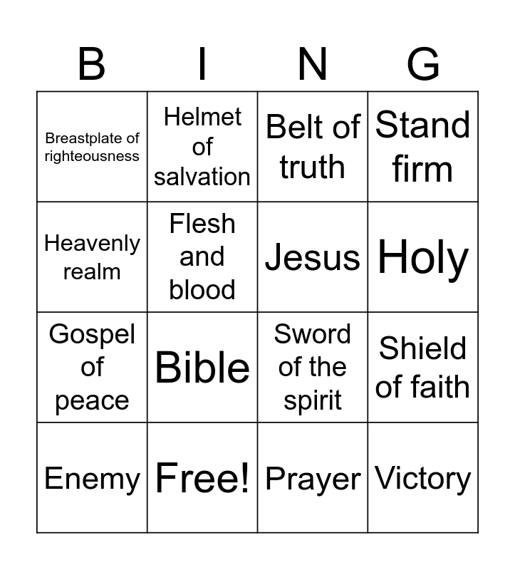 This bingo card has 16 words: Free!, Shield of faith, Belt of truth, Breastplate of righteousness, Gospel of peace, Helmet of salvation, Sword of the spirit, Prayer, Heavenly realm, Flesh and blood, Enemy, Stand firm, Bible, Holy, Jesus and Victory.