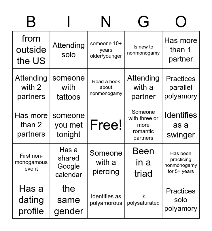 This bingo card has a free space and 30 words: the same gender, different gender, someone you met tonight, a parent, from outside the US, someone 10+ years older/younger, someone with tattoos, Someone with a piercing, Someone with three or more romantic partners, Identifies as polyamorous, Identifies as a swinger, Practices solo polyamory, Is polysaturated, Practices kitchen table Polyamory, Practices parallel polyamory, Seeking an anchor/primary partner, Been in a triad, First non-monogamous event, Has a shared Google calendar, Has more than 1 partner, Has more than 2 partners, Identifies as queer, Attending solo, Attending with a partner, Attending with 2 partners, Is new to nonmonogamy, Has been practicing nonmonogamy for 5+ years, Has a dating profile, Read a book about nonmonogamy and Plays board games.