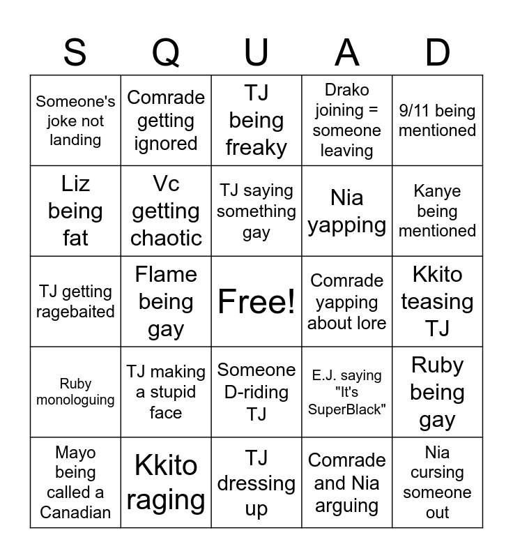 This bingo card has a free space and 24 words: TJ making a stupid face, Kkito raging, TJ saying something gay, Mayo being called a Canadian, 9/11 being mentioned, Someone's joke not landing, Liz being fat, Comrade getting ignored, Comrade yapping about lore, Someone D-riding TJ, Nia yapping, TJ getting ragebaited, E.J. saying "It's SuperBlack", Ruby being gay, Vc getting chaotic, Comrade and Nia arguing, Kkito teasing TJ, TJ being freaky, Kanye being mentioned, Flame being gay, Nia cursing someone out, Ruby monologuing, Drako joining = someone leaving and TJ dressing up.