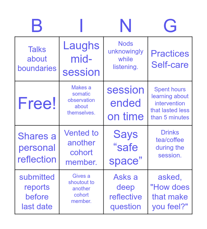 This bingo card has 16 words: Gives a shoutout to another cohort member., Drinks tea/coffee during the session., Nods unknowingly while listening., Talks about boundaries, Shares a personal reflection, Laughs mid-session, Says “safe space”, Asks a deep reflective question, Free!, Makes a somatic observation about themselves., submitted reports before last date, Practices Self-care, Vented to another cohort member., Spent hours learning about intervention that lasted less than 5 minutes, session ended on time and asked, "How does that make you feel?".