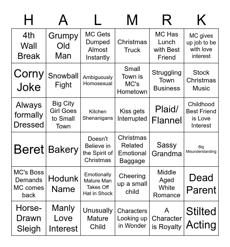 This bingo card has 47 words: Fell in love in less then a week, Always formally Dressed, Character named after something Christmassy, Sassy Grandma, Plaid/ Flannel, Cheering up a small child, Grumpy Old Man, Long Awkward Silence, MC gives up job to be with love interest, Manly Love Interest, Corny Joke, Christmas Truck, Bakery, Beret, A Character is Royalty, Emotionally Mature Man Takes Off Hat in Shock, Snowball Fight, Big City Girl Goes to Small Town, Chekhov's Gun, MC Has Lunch with Best Friend, Stock Christmas Music, Big Misunderstanding, 4th Wall Break, Ambiguously Homosexual, Falling in Snow Laughing, Small Town is MC's Hometown, Doesn't Believe in the Spirit of Christmas, Awkward Meetup Between MC and Love Interest, Childhood Best Friend is Love Interest, Kiss gets Interrupted, Snows Just in Time for Christmas, Hodunk Name, Characters Looking up in Wonder, Stilted Acting, Unusually Mature Child, Christmas Related Emotional Baggage, Kitchen Shenanigans, Horse- Drawn Sleigh, Someone Complains about the Cold, Middle Aged White Romance, MC's Boss Demands MC comes back, MC Gets Dumped Almost Instantly, Struggling Town Business, Token Black Character, Shakey Camera, Dead Parent and Someone Leaves before Food comes.