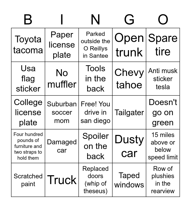 This bingo card has a free space and 24 words: Damaged car, Truck, Tools in the back, Scratched paint, Spare tire, Toyota tacoma, Usa flag sticker, Paper license plate, Tailgater, Spoiler on the back, Chevy tahoe, College license plate, Dusty car, 15 miles above or below speed limit, No muffler, Taped windows, Doesn't go on green, Parked outside the O Reillys in Santee, Anti musk sticker tesla, Suburban soccer mom, Row of plushies in the rearview, Four hundred pounds of furniture and two straps to hold them, Open trunk and Replaced doors (whip of theseus).