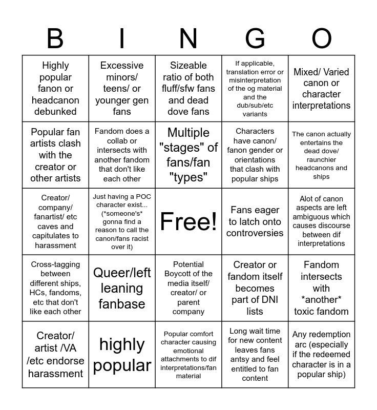 This bingo card has a free space and 24 words: Queer/left leaning fanbase, highly popular, Multiple "stages" of fans/fan "types", Creator/ artist /VA /etc endorse harassment, Mixed/ Varied canon or character interpretations, Highly popular fanon or headcanon debunked, Popular fan artists clash with the creator or other artists, Excessive minors/ teens/ or younger gen fans, Fans eager to latch onto controversies, Potential Boycott of the media itself/ creator/ or parent company, Characters have canon/ fanon gender or orientations that clash with popular ships, Creator/ company/ fanartist/ etc caves and capitulates to harassment, Creator or fandom itself becomes part of DNI lists, Fandom intersects with *another* toxic fandom, Fandom does a collab or intersects with another fandom that don't like each other, Long wait time for new content leaves fans antsy and feel entitled to fan content, Alot of canon aspects are left ambiguous which causes discourse between dif interpretations, Sizeable ratio of both fluff/sfw fans and dead dove fans, The canon actually entertains the dead dove/ raunchier headcanons and ships, Just having a POC character exist... (*someone's* gonna find a reason to call the canon/fans racist over it), Any redemption arc (especially if the redeemed character is in a popular ship), Cross-tagging between different ships, HCs, fandoms, etc that don't like each other, If applicable, translation error or misinterpretation of the og material and the dub/sub/etc variants and Popular comfort character causing emotional attachments to dif interpretations/fan material.