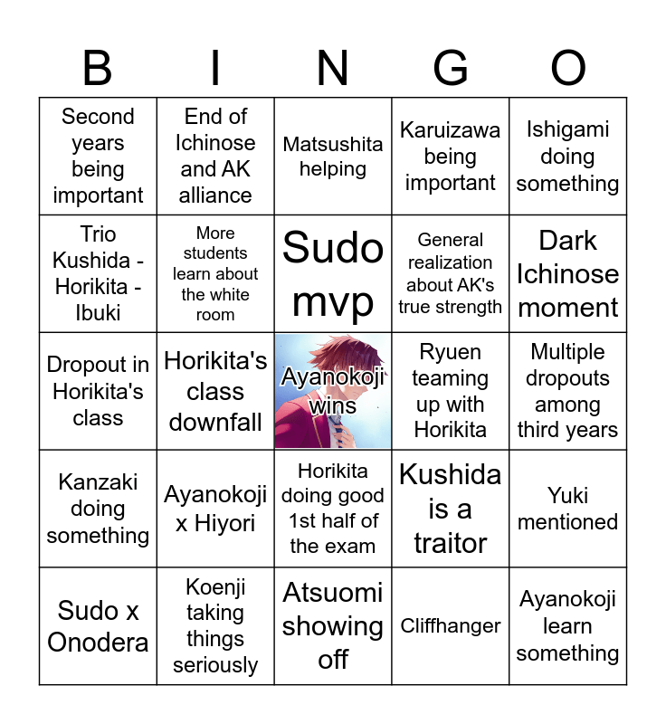 This bingo card has a free space and 24 words: Ayanokoji x Hiyori, Koenji taking things seriously, Sudo mvp, Sudo x Onodera, Ishigami doing something, Second years being important, Trio Kushida - Horikita - Ibuki, End of Ichinose and AK alliance, Ryuen teaming up with Horikita, Horikita doing good 1st half of the exam, General realization about AK's true strength, Dropout in Horikita's class, Kushida is a traitor, Yuki mentioned, More students learn about the white room, Cliffhanger, Multiple dropouts among third years, Matsushita helping, Dark Ichinose moment, Horikita's class downfall, Ayanokoji learn something, Kanzaki doing something, Karuizawa being important and Atsuomi showing off.