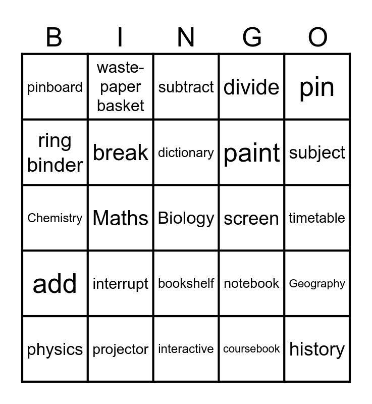 This bingo card has a free space and 26 words: bookshelf, coursebook, dictionary, projector, pin, pinboard, ring binder, waste-paper basket, timetable, notebook, paint, Chemistry, Geography, physics, Maths, multiply, divide, add, subtract, history, subject, interactive, screen, interrupt, break and sports hall.