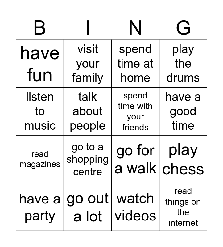 This bingo card has 16 words: go out a lot, play chess, spend time at home, have fun, read magazines, visit your family, go for a walk, watch videos, listen to music, talk about people, have a party, play the drums, go to a shopping centre, have a good time, spend time with your friends and read things on the internet.
