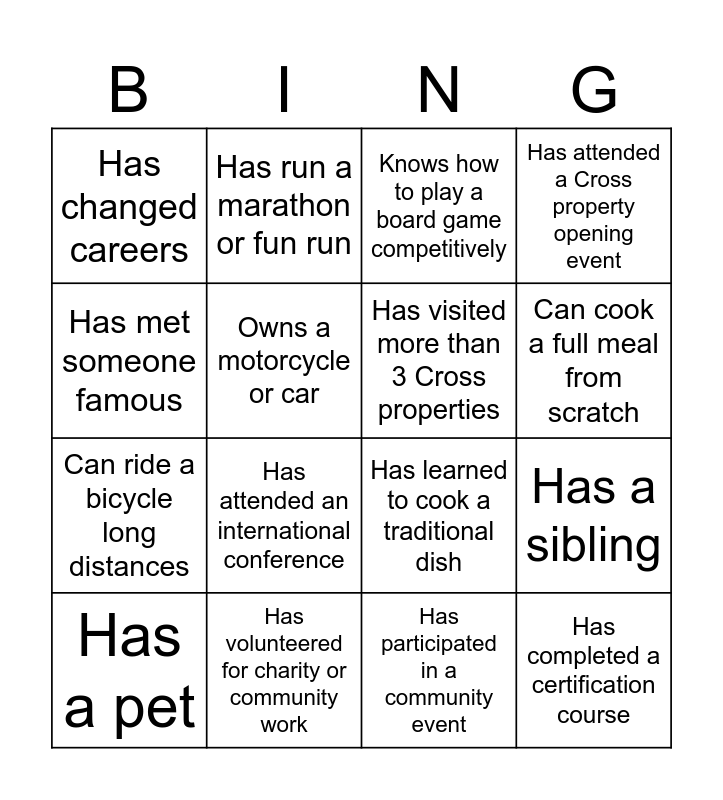 This bingo card has 46 words: Age over 40, Has a pet, Has kids, Traveled abroad to more than 3 countries, Works at Cross for more than 2 years, Speaks more than 2 languages, Has run a marathon or fun run, Plays a musical instrument, Owns a motorcycle or car, Has been with Cross for less than 1 year, Has visited more than 3 Cross properties, Has attended a Cross property opening event, Has attended a Cross training or workshop before, Can dance (any style), Has a favorite movie they can watch over and over, Has a hidden talent (magic, singing, etc.), Can cook a full meal from scratch, Has volunteered for charity or community work, Has a tattoo, Has met someone famous, Has a sibling, Owns a house or apartment, Has changed careers, Can ride a bicycle long distances, Has learned a new skill in the last year, Has attended an international conference, Can swim, Has lived in more than 2 cities, Has presented in public or given a speech, Has completed a certification course, Has a favorite sports team, Has tried a new food in the last month, Owns a musical instrument, Has painted or drawn something in the past year, Has met someone from another country, Has taken a professional photo, Has participated in a community event, Has gone camping, Has ridden a horse, Has attended a live concert, Has been in a team competition, Knows how to play a board game competitively, Has learned to cook a traditional dish, Has stayed overnight in a different city for work, Has used public transport exclusively for a day and Age over 35.