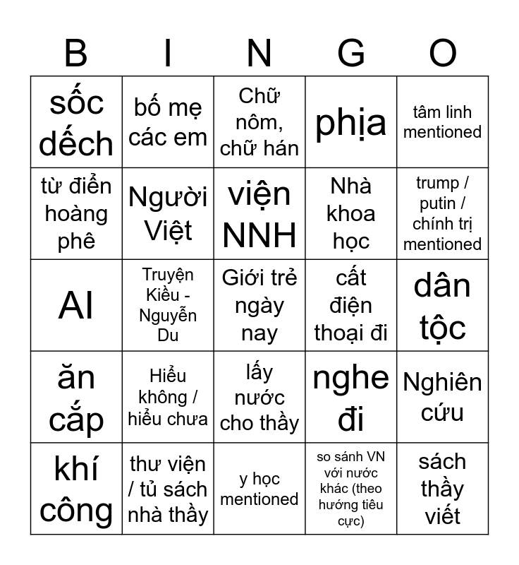 This bingo card has a free space and 24 words: Hiểu không / hiểu chưa, thư viện / tủ sách nhà thầy, viện NNH, khí công, tâm linh mentioned, sốc dếch, từ điển hoàng phê, bố mẹ các em, cất điện thoại đi, lấy nước cho thầy, Nhà khoa học, AI, nghe đi, Nghiên cứu, Người Việt, so sánh VN với nước khác (theo hướng tiêu cực), dân tộc, Chữ nôm, chữ hán, trump / putin / chính trị mentioned, Truyện Kiều - Nguyễn Du, sách thầy viết, ăn cắp, phịa and y học mentioned.