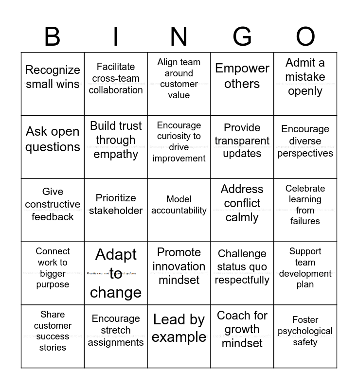 This bingo card has 24 images, a free space and 24 words: Adapt to change, Encourage stretch assignments, Encourage curiosity to drive improvement, Share customer success stories, Admit a mistake openly, Recognize small wins, Ask open questions, Facilitate cross-team collaboration, Address conflict calmly, Promote innovation mindset, Provide transparent updates, Give constructive feedback, Challenge status quo respectfully, Support team development plan, Build trust through empathy, Coach for growth mindset, Celebrate learning from failures, Align team around customer value, Encourage diverse perspectives, Prioritize stakeholder, Foster psychological safety, Connect work to bigger purpose, Empower others and Lead by example.