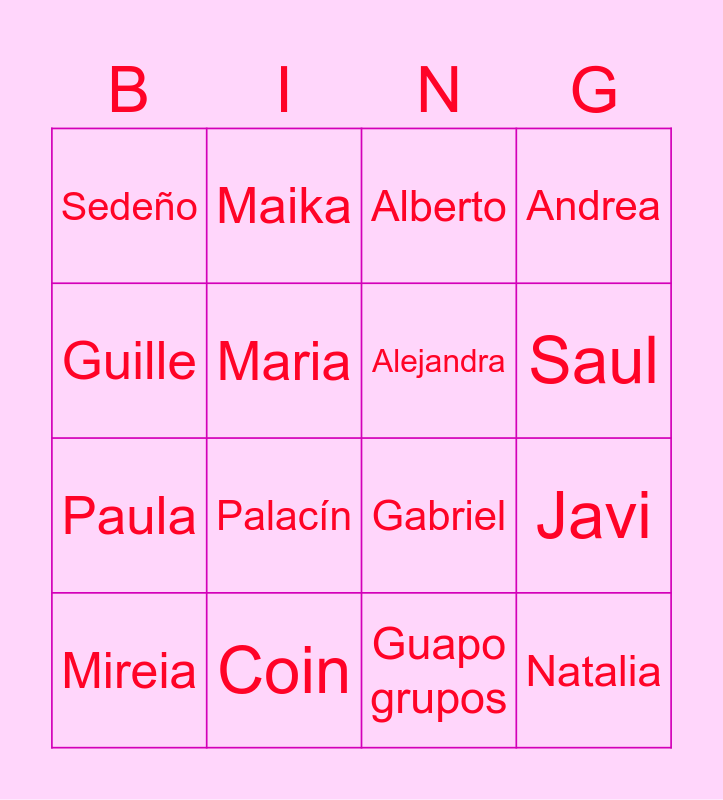 This bingo card has 18 words: Palacín, Natalia, Alberto, Sedeño, Gabriel, Andrea, Mireia, Maika, Saul, Paula, Guapo grupos, Guille, Javi, Maria, Alejandra, Evo, Coin and Huevo.