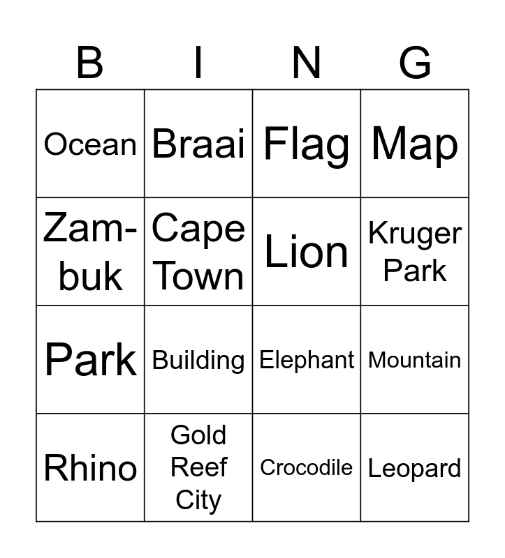 This bingo card has 16 words: Gold Reef City, Mountain, Flag, Ocean, Park, Braai, Elephant, Crocodile, Zam-buk, Cape Town, Rhino, Map, Building, Kruger Park, Lion and Leopard.