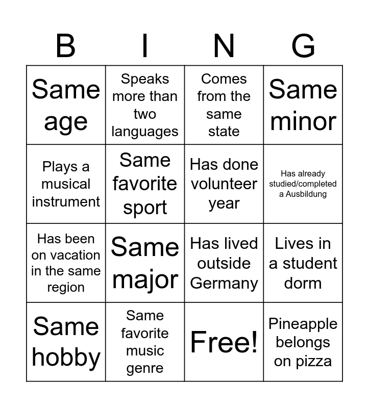This bingo card has 17 words: Free!, Same hobby, Comes from the same state, Same age, Same major, Same minor, Lives in a student dorm, Has done volunteer year, Has already studied/completed a Ausbildung, Same favorite sport, Same favorite music genre, Has lived outside Germany, Plays a musical instrument, Speaks more than two languages, Has been on vacation in the same region, Has a pet and Pineapple belongs on pizza.