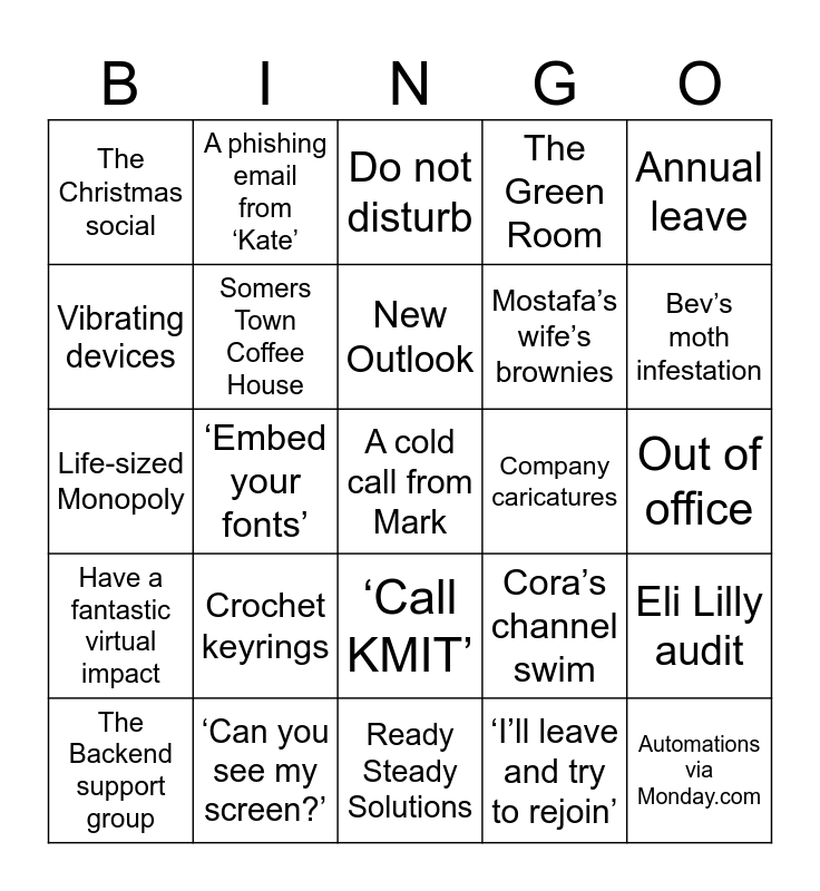 This bingo card has 39 words: Virtual water cooler chat, Nord VPN, Forgetting to unmute on Teams, Somers Town Coffee House, The Backend support group, ‘Call KMIT’, New Outlook, #e5007e, Annual leave, Have a fantastic virtual impact, ‘Embed your fonts’, The Green Room, A cold call from Mark, Out of office, Company caricatures, Crochet keyrings, The summer social, The Christmas social, The Method spark, Cora’s channel swim, Vibrating devices, Ready Steady Solutions, Mostafa’s wife’s brownies, Bev’s moth infestation, The aging AR filter, LastPass, Automations via Monday.com, Andy’s yellow shelves, ‘Ask ChatGPT’, A phishing email from ‘Kate’, Katya’s handmade bags, Rockstar applause, Do not disturb, ‘Can you see my screen?’, ‘I’ll leave and try to rejoin’, Raising your hand instead of clicking the applause reaction, Eli Lilly audit, Life-sized Monopoly and Monthly business update.