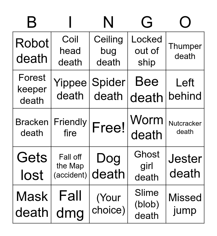 This bingo card has a free space and 24 words: Fall off the Map (accident), Fall dmg, Spider death, Mask death, Thumper death, Robot death, Forest keeper death, Coil head death, Worm death, Dog death, Bee death, Bracken death, Ghost girl death, Jester death, Yippee death, Slime (blob) death, Nutcracker death, Ceiling bug death, Left behind, Friendly fire, Missed jump, Gets lost, Locked out of ship and (Your choice).