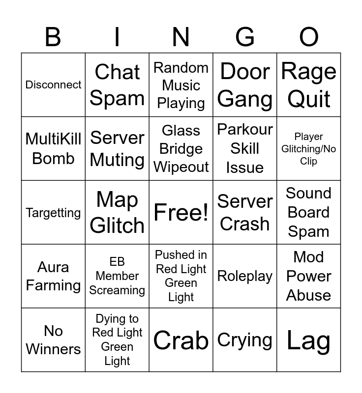 This bingo card has a free space and 24 words: EB Member Screaming, Dying to Red Light Green Light, Glass Bridge Wipeout, No Winners, Rage Quit, Disconnect, MultiKill Bomb, Chat Spam, Server Crash, Pushed in Red Light Green Light, Parkour Skill Issue, Targetting, Roleplay, Mod Power Abuse, Server Muting, Crying, Sound Board Spam, Random Music Playing, Player Glitching/No Clip, Map Glitch, Lag, Aura Farming, Door Gang and Crab.