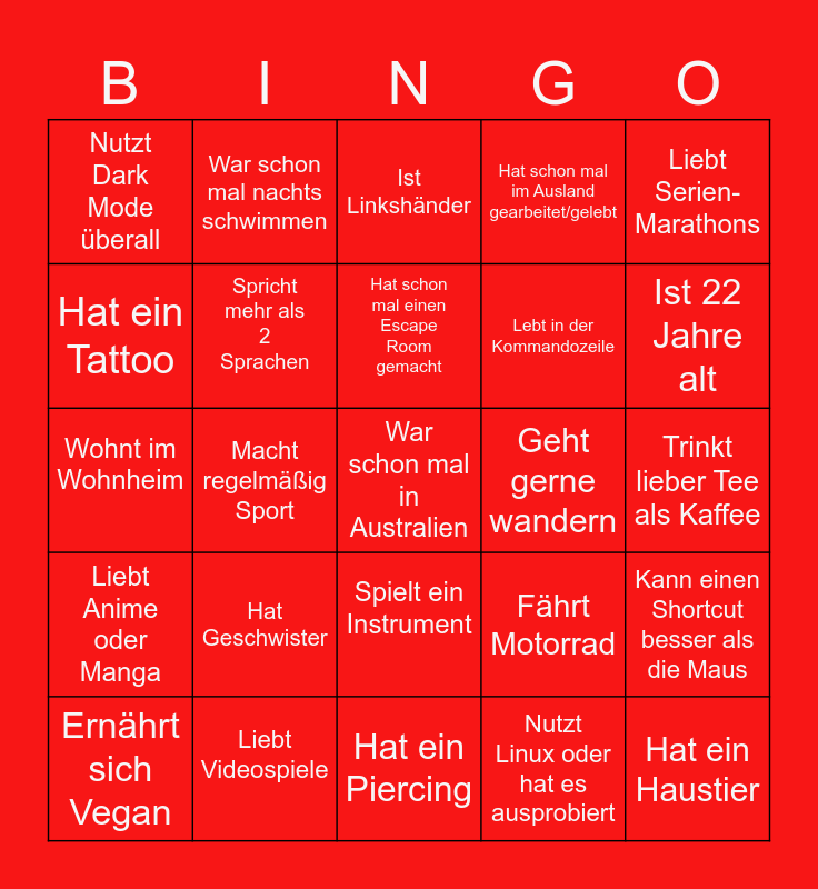 This bingo card has 40 words: Hat denselben Studiengang wie du, Wohnt im Wohnheim, Ist neu in dieser Stadt, Spricht mehr als 2 Sprachen, Liebt Videospiele, Spielt ein Instrument, Hat schon mal einen Escape Room gemacht, War schon mal auf einem Festival, Liebt Serien-Marathons, Liebt Anime oder Manga, Macht regelmäßig Sport, Hat schon mal im Ausland gearbeitet/gelebt, War schon mal in Australien, Trinkt lieber Tee als Kaffee, Geht gerne wandern, Hat Geschwister, Liebt Pizza, Nutzt Dark Mode überall, Name fängt mit A an, Ist Linkshänder, Kann einen Shortcut besser als die Maus, Nutzt Linux oder hat es ausprobiert, Lebt in der Kommandozeile, Hat ein Tattoo, Fährt Snowboard oder Ski, Weiß, was eine While-Schleife ist, Trägt eine Brille, Hat schon mal eine eigene Website gebaut, Hat ein Haustier, Kennt mindestens 3 Memes auswendig, Hat kein Instagram oder Tik-Tok, Ernährt sich Vegan, Liest gerne, Fährt Motorrad, Ist 22 Jahre alt, Hat ein Piercing, Spielt lieber Konsole als PC, Hat mehr als 2 Kontinente besucht, War schon mal nachts schwimmen and Besitzt ein Fahrrad.