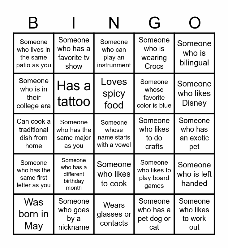 This bingo card has 70 words: Someone who comes from a different state, Someone who has an exotic pet, Someone whose favorite food is pizza, Someone who plays a sport, Someone who goes by a nickname, Someone who likes to draw, Someone who is wearing Crocs, Someone who likes to read, Someone who is bilingual, Someone who plays video games, Someone who is left handed, Someone who went on vacation this summer, Someone who lives in the same patio as you, Someone who can play an instrunment, Someone who saw a great movie this summer, Someone who has the same major as you, Someone who likes to cook, Someone whose favorite color is blue, Someone who has broken a bone, Someone who has the same first letter as you, Someone who likes to do crafts, Someone who likes to play board games, Someone who likes Disney, Someone who has been to a concert, Someone who has visited another country, Someone who likes Dreamworks, Someone with the same birthday month, Someone who likes to dance, Someone who has a pet dog or cat, Someone who likes to be outdoors, Someone who has a favorite tv show, Someone who has siblings, Someone you don't know, Someone whose favorite food is pasta, Someone who has a hobby, Someone who likes Broadway shows, Someone who likes Starbucks, Someone who likes Dutch Bros, Someone who likes Taylor Swift, Someone who is in their college era, Someone who likes to work out, Someone who has a different birthday month, Someone whose name starts with a vowel, Someone who likes the same music as you, Someone who likes spicy food, Has a tattoo, Was born in May, Is bilingual (native in two languages), Plays a musical instrument, Has dyed hair, Speaks more than three languages, Has a pet back home, Plays a sport regularly, Has visited more than five countries, Wears glasses or contacts, Has a nickname only friends use, Loves spicy food, Collects something unusual, Has a unique hobby (e.g., juggling, calligraphy), Is left-handed, Can cook a traditional dish from home, Has moved cities more than three times, Has a hidden talent, Is a morning person, Has broken a bone before, Has a piercing, Speaks a minority language, Has a scar with a story, Has met a celebrity and Has run a race or marathon.