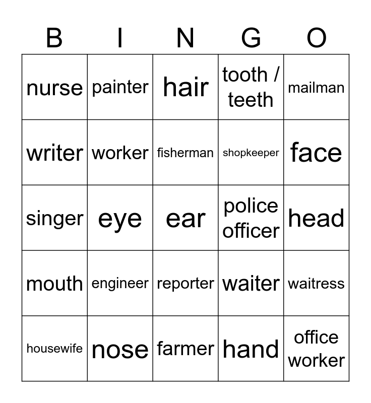 This bingo card has 25 words: engineer, farmer, fisherman, housewife, mailman, nurse, writer, painter, police officer, reporter, shopkeeper, singer, waiter, waitress, worker, office worker, head, hair, face, eye, ear, nose, mouth, tooth / teeth and hand.