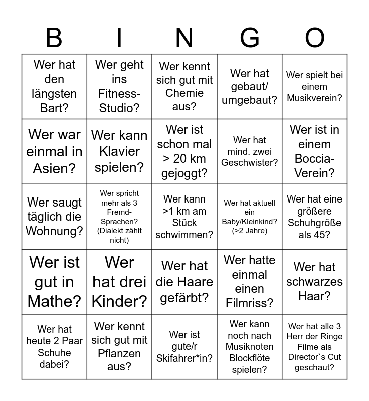 This bingo card has a free space and 29 words: Wer hat heute 2 Paar Schuhe dabei?, Wer hat lange Ohrringe an?, Wer spricht mehr als 3 Fremd-Sprachen? (Dialekt zählt nicht), Wer arbeitet mit Kindern?, Wer hat den längsten Bart?, Wer kennt sich gut mit Chemie aus?, Wer kann Klavier spielen?, Wer hat drei Kinder?, Wer hat aktuell ein Baby/Kleinkind? (>2 Jahre), Wer kennt sich gut mit Pflanzen aus?, Wer hat eine größere Schuhgröße als 45?, Wer hat alle 3 Herr der Ringe Filme als Director`s Cut geschaut?, Wer ist gute/r Skifahrer*in?, Wer kann noch nach Musiknoten Blockflöte spielen?, Wer ist in einem Boccia-Verein?, Wer hat einen Hund als Haustier?, Wer hat die Haare gefärbt?, Wer ist gut in Mathe?, Wer spielt bei einem Musikverein?, Wer saugt täglich die Wohnung?, Wer hatte einmal einen Filmriss?, Wer trägt einen schwarzen Anzug?, Wer hat mind. zwei Geschwister?, Wer war einmal in Asien?, Wer hat gebaut/ umgebaut?, Wer geht ins Fitness-Studio?, Wer hat schwarzes Haar?, Wer ist schon mal > 20 km gejoggt? and Wer tanzt aktuell in einem Tanzclub?.