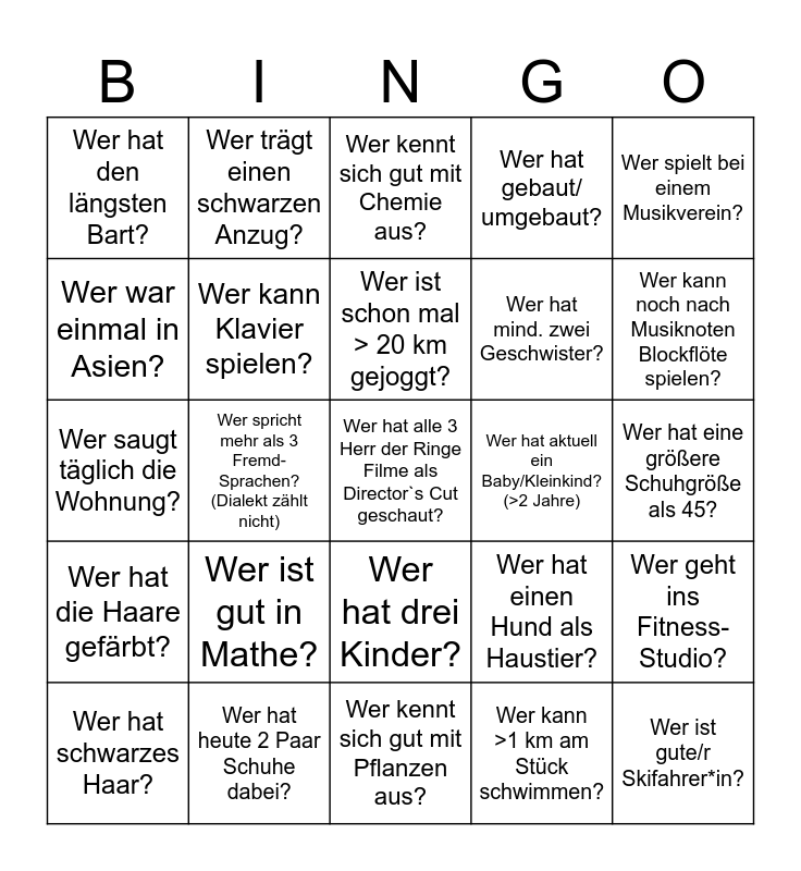 This bingo card has 30 words: Wer hat heute 2 Paar Schuhe dabei?, Wer hat lange Ohrringe an?, Wer spricht mehr als 3 Fremd-Sprachen? (Dialekt zählt nicht), Wer arbeitet mit Kindern?, Wer hat den längsten Bart?, Wer kennt sich gut mit Chemie aus?, Wer kann Klavier spielen?, Wer hat drei Kinder?, Wer hat aktuell ein Baby/Kleinkind? (>2 Jahre), Wer kennt sich gut mit Pflanzen aus?, Wer hat eine größere Schuhgröße als 45?, Wer hat alle 3 Herr der Ringe Filme als Director`s Cut geschaut?, Wer kann >1 km am Stück schwimmen?, Wer ist gute/r Skifahrer*in?, Wer kann noch nach Musiknoten Blockflöte spielen?, Wer ist in einem Boccia-Verein?, Wer hat einen Hund als Haustier?, Wer hat die Haare gefärbt?, Wer ist gut in Mathe?, Wer spielt bei einem Musikverein?, Wer saugt täglich die Wohnung?, Wer hatte einmal einen Filmriss?, Wer trägt einen schwarzen Anzug?, Wer hat mind. zwei Geschwister?, Wer war einmal in Asien?, Wer hat gebaut/ umgebaut?, Wer geht ins Fitness-Studio?, Wer hat schwarzes Haar?, Wer ist schon mal > 20 km gejoggt? and Wer tanzt aktuell in einem Tanzclub?.