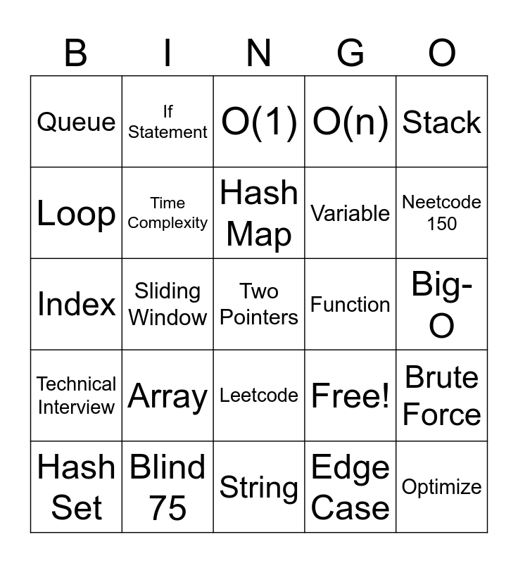 This bingo card has 25 words: Array, String, Hash Map, Hash Set, Stack, Queue, Loop, If Statement, Function, Leetcode, Variable, Index, Free!, Brute Force, Time Complexity, Optimize, Big-O, O(1), Neetcode 150, Sliding Window, Two Pointers, Blind 75, Technical Interview, O(n) and Edge Case.