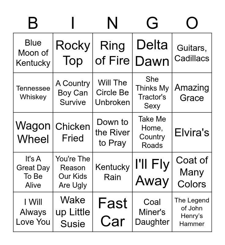 This bingo card has 26 words: Kentucky Rain, Coal Miner's Daughter, Will The Circle Be Unbroken, Wake up Little Susie, Guitars, Cadillacs, Blue Moon of Kentucky, Tennessee Whiskey, Rocky Top, Elvira's, I'll Fly Away, She Thinks My Tractor's Sexy, Wagon Wheel, Coat of Many Colors, I Will Always Love You, Chicken Fried, Big Bad John, Delta Dawn, It's A Great Day To Be Alive, Ring of Fire, Down to the River to Pray, Amazing Grace, Fast Car, Take Me Home, Country Roads, You're The Reason Our Kids Are Ugly, A Country Boy Can Survive and The Legend of John Henry’s Hammer.