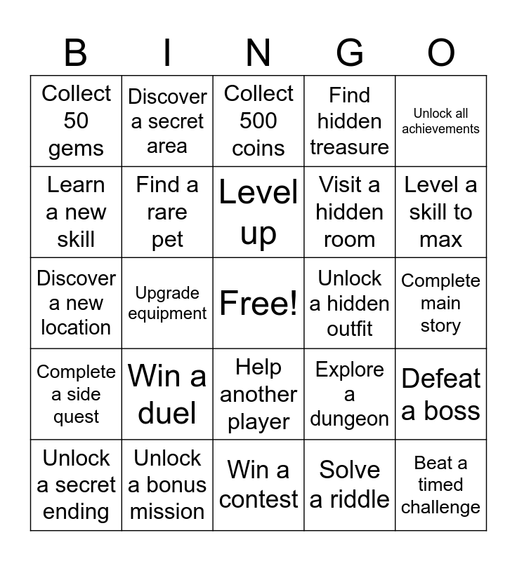This bingo card has a free space and 64 words: Free Space, Complete 3 quests, Find a rare item, Defeat a boss, Craft something new, Talk to an NPC, Discover a secret area, Collect 100 coins, Level up, Win a mini-game, Help another player, Explore every zone, Complete main story, Unlock all achievements, Beat final boss, Learn a new skill, Upgrade equipment, Collect 50 gems, Solve a puzzle, Visit a hidden room, Win a duel, Complete a side quest, Find hidden treasure, Unlock a new area, Defeat a mini-boss, Upgrade your house, Meet a new character, Discover a shortcut, Win a race, Collect rare materials, Complete daily quest, Craft a legendary item, Discover hidden lore, Find a secret passage, Level a skill to max, Unlock a secret ending, Trade with another player, Solve a riddle, Complete all challenges, Find a rare pet, Discover a new location, Unlock a hidden outfit, Win a tournament, Craft a potion, Collect 10 rare items, Beat a timed challenge, Unlock a bonus mission, Complete a guild quest, Explore a dungeon, Unlock a hidden boss, Find a rare mount, Craft a weapon, Win a contest, Discover a secret NPC, Complete an achievement set, Upgrade your armor, Collect 500 coins, Find a hidden book, Unlock a new ability, Solve a mystery, Complete a map, Unlock a special skill, Craft a special item and Celebrate victory.