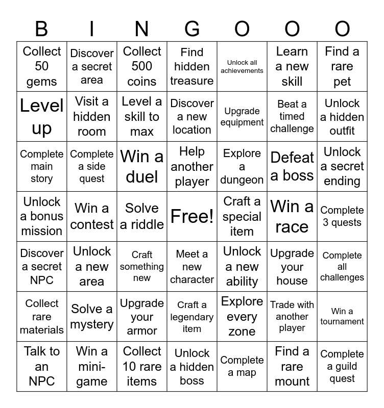 This bingo card has a free space and 64 words: Free Space, Complete 3 quests, Find a rare item, Defeat a boss, Craft something new, Talk to an NPC, Discover a secret area, Collect 100 coins, Level up, Win a mini-game, Help another player, Explore every zone, Complete main story, Unlock all achievements, Beat final boss, Learn a new skill, Upgrade equipment, Collect 50 gems, Solve a puzzle, Visit a hidden room, Win a duel, Complete a side quest, Find hidden treasure, Unlock a new area, Defeat a mini-boss, Upgrade your house, Meet a new character, Discover a shortcut, Win a race, Collect rare materials, Complete daily quest, Craft a legendary item, Discover hidden lore, Find a secret passage, Level a skill to max, Unlock a secret ending, Trade with another player, Solve a riddle, Complete all challenges, Find a rare pet, Discover a new location, Unlock a hidden outfit, Win a tournament, Craft a potion, Collect 10 rare items, Beat a timed challenge, Unlock a bonus mission, Complete a guild quest, Explore a dungeon, Unlock a hidden boss, Find a rare mount, Craft a weapon, Win a contest, Discover a secret NPC, Complete an achievement set, Upgrade your armor, Collect 500 coins, Find a hidden book, Unlock a new ability, Solve a mystery, Complete a map, Unlock a special skill, Craft a special item and Celebrate victory.