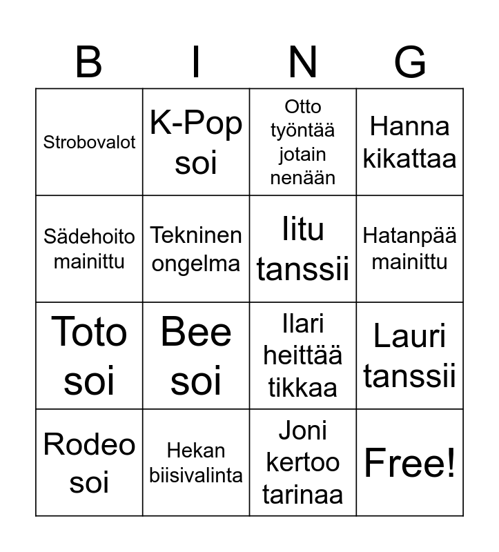 This bingo card has 23 words: Free!, TAYS mainittu, Hatanpää mainittu, Sytostaatit mainittu, Sädehoito mainittu, Strobovalot, Tekninen ongelma, K-Pop soi, Rodeo soi, Bess soi, Bee soi, Toto soi, Guns'n'Roses soi, Scorpions soi, Hekan biisivalinta, Heka tiputtaa jotain, Otto työntää jotain nenään, Ilari heittää tikkaa, Iitu tanssii, Lauri tanssii, Hanna kikattaa, Joni kertoo tarinaa and Palju on liian kuuma.
