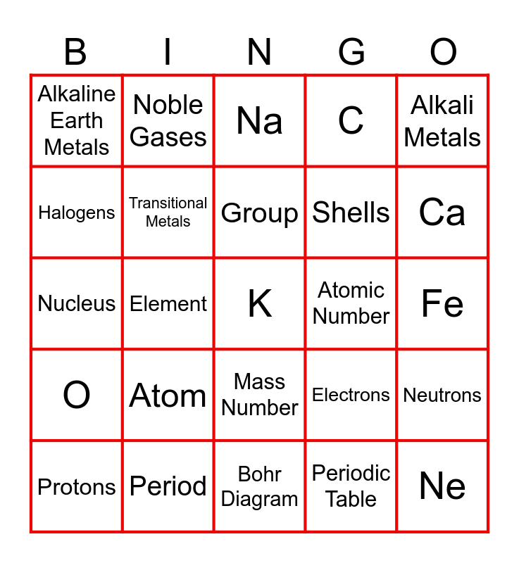 This bingo card has a free space and 24 words: Atom, Period, Group, Protons, Alkali Metals, Alkaline Earth Metals, Halogens, Noble Gases, Atomic Number, Mass Number, Shells, Nucleus, Electrons, Neutrons, Transitional Metals, Periodic Table, Fe, Na, Ca, Element, Ne, O, C and Bohr Diagram.