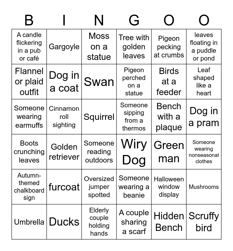 This bingo card has 36 words: Someone wearing a beanie, Oversized jumper spotted, A couple sharing a scarf, Flannel or plaid outfit, Boots crunching leaves, Someone sipping from a thermos, Dog in a coat, Elderly couple holding hands, Pigeon pecking at crumbs, Halloween window display, Leaf shaped like a heart, Tree with golden leaves, Mushrooms, Cinnamon roll sighting, Pigeon perched on a statue, A candle flickering in a pub or café, Autumn-themed chalkboard sign, Bench with a plaque, Someone wearing earmuffs, Moss on a statue, Squirrel, Golden retriever, Wiry Dog, Someone reading outdoors, Green man, Gargoyle, Birds at a feeder, Ducks, Swan, leaves floating in a puddle or pond, Scruffy bird, Umbrella, Someone wearing nonseasonal clothes, Dog in a pram, furcoat and Hidden Bench.