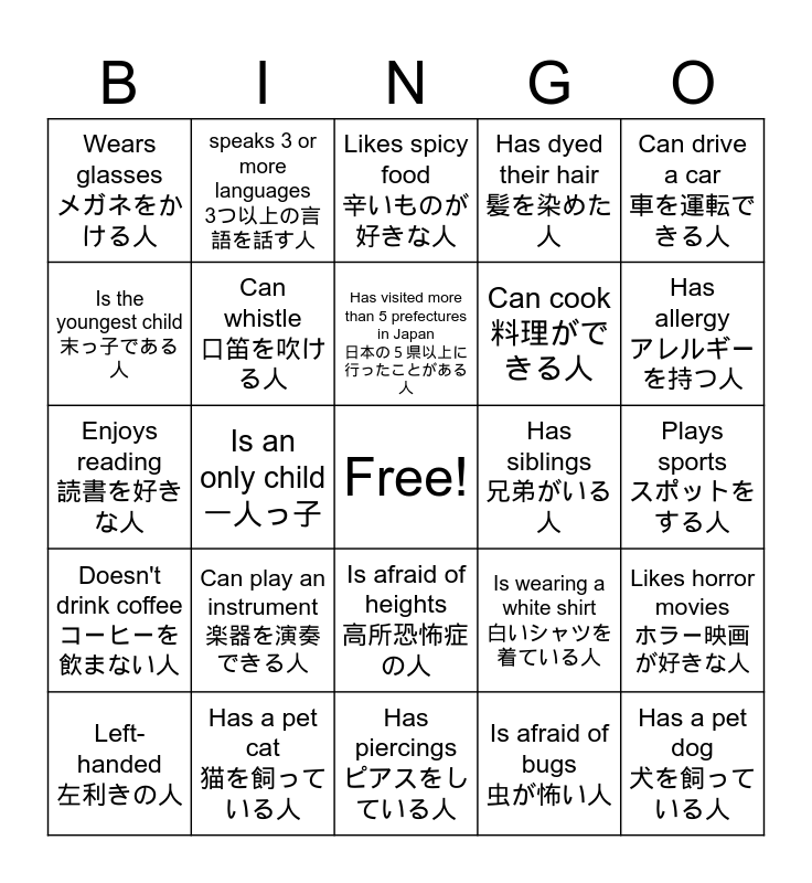 This bingo card has a free space and 29 words: Left-handed 左利きの人, Drinks coffee コーヒーを飲める人, Is an only child 一人っ子, Born in the same month as you あなたと同じ月に生まれた人, Wears glasses メガネをかける人, Likes spicy food 辛いものが好きな人, Can whistle 口笛を吹ける人, Can play an instrument 楽器を演奏できる人, Has siblings 兄弟がいる人, Has a pet cat 猫を飼っている人, Plays sports スポットをする人, Has a pet dog 犬を飼っている人, Has piercings ピアスをしている人, Is afraid of bugs 虫が怖い人, Has allergy アレルギーを持つ人, Likes karaoke カラオケが好きな人, Is afraid of heights 高所恐怖症の人, Doesn't drink coffee コーヒーを飲まない人, Can drive a car 車を運転できる人, Enjoys reading 読書を好きな人, Is wearing a white shirt 白いシャツを着ている人, Can wink with both eyes 両目でウインクできる人, Can cook 料理ができる人, Is the youngest child 末っ子である人, Has dyed their hair 髪を染めた人, speaks 3 or more languages 3つ以上の言語を話す人, Likes horror movies ホラー映画が好きな人, Has visited more than 5 prefectures in Japan 日本の5県以上に行ったことがある人 and Doesn't like rollercoasters ジェットコースターが苦手な人.