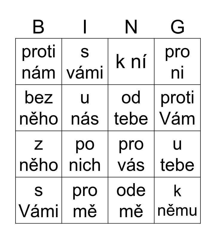 This bingo card has 16 words: pro mě, u tebe, k ní, proti nám, z něho, s vámi, pro vás, ode mě, bez něho, u nás, s Vámi, pro ni, po nich, proti Vám, od tebe and k němu.