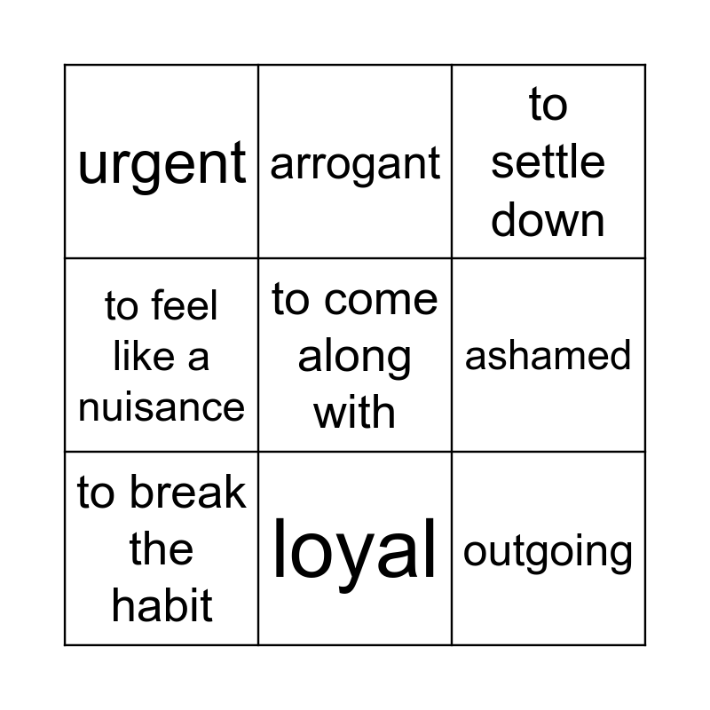 This bingo card has 9 words: to break the habit, to settle down, arrogant, to feel like a nuisance, urgent, ashamed, to come along with, outgoing and loyal.