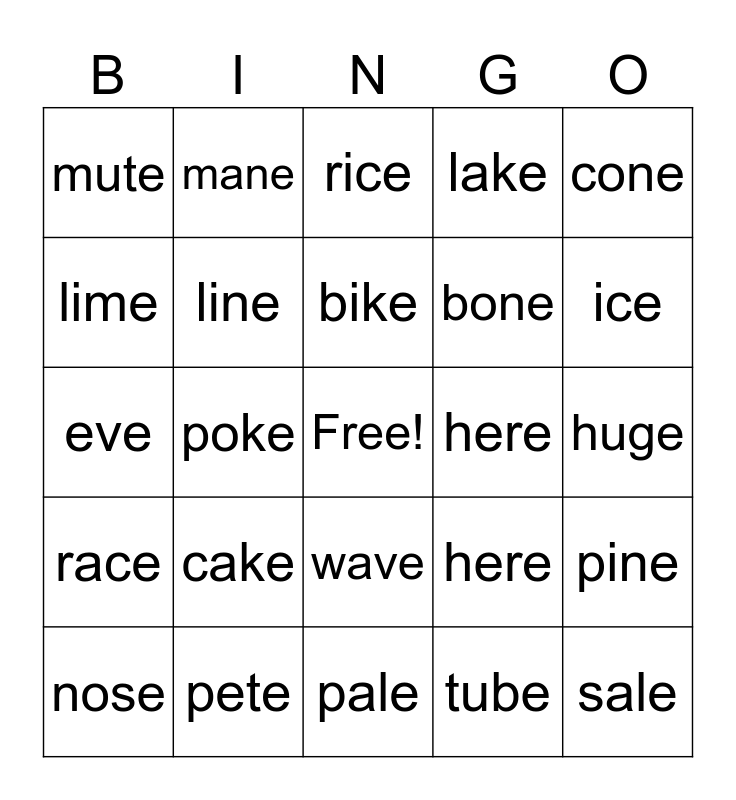 This bingo card has a free space and 24 words: cake, pete, bike, nose, cone, mute, lime, mane, here, wave, bone, eve, here, pine, line, tube, huge, rice, ice, poke, sale, race, lake and pale.